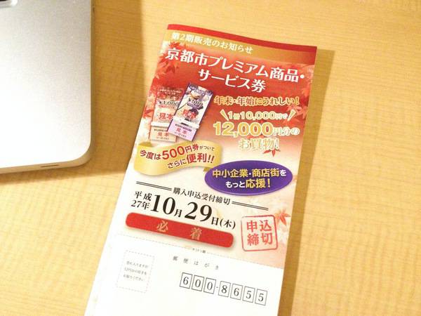 (追記) 京都市プレミアム商品・サービス券の第2期販売の応募は平成27年10月29日(木)で締め切られています。