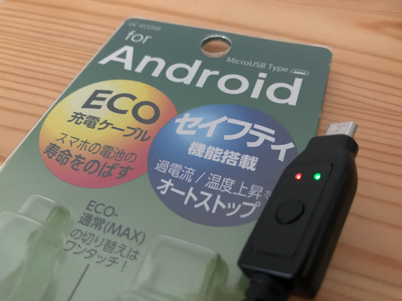 右側の緑のランプは、ECO充電モードであることを示している。下の黒い丸ボタンを長押しすることで、ECO充電モードのON/OFFを切り替えられるので、OFFにすると、普通のUSBケーブルと同じように常に充電状態になる。